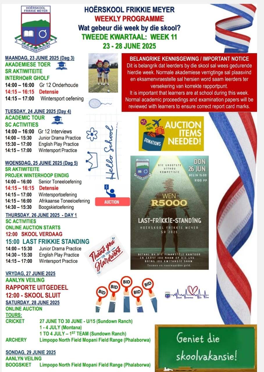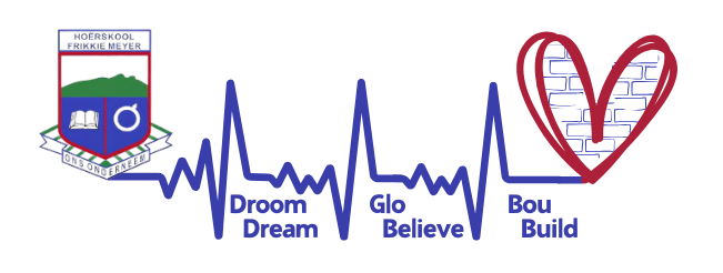 Frikkie Meyer se motto vir 2026 is 'Droom. Glo. Bou'! Hier word elke leerder aangemoedig word om groot te droom, vas te glo, en met doelgerigtheid te bou. Ons daag leerders uit om verder te kyk as vandag. Om groot drome te koester, hul talente te ontdek en hul eie toekoms met hoop en visie te sien. ’n Droom is die eerste saadjie van sukses. Ons glo dat elke leerder uniek geskape is met potensiaal. Deur geloof in jouself, in ander en in die waardes wat ons as skool dra, word moed gebou om uitdagings aan te pak en aan te hou wanneer dit moeilik raak. Met drome as rigting en geloof as fondasie, bou ons karakter, kennis en vaardighede. Ons bou aan lewens, verhoudings en ’n toekoms waarin verantwoordelikheid, deursettingsvermoë en integriteit sentraal staan. “Droom. Glo. Bou.” is meer as ’n tema — dit is ’n lewenshouding. By Hoërskool Frikkie Meyer bou ons vandag aan die leiers, denkers en doeners van môre.